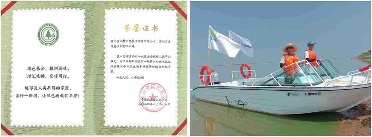 2024年6月,,公司携手中国绿色碳汇基金会,,,,开展“保卫江豚”公益活动,,,向基金会捐赠人民币20万元用于采购全新巡逻艇,,以支持鄱阳湖长江江豚保护工作。。。。截至2024年底,,,,公司捐赠的资金与巡逻艇已经有效协助巡护队对鄱阳湖1,667头江豚开展保护行动。。