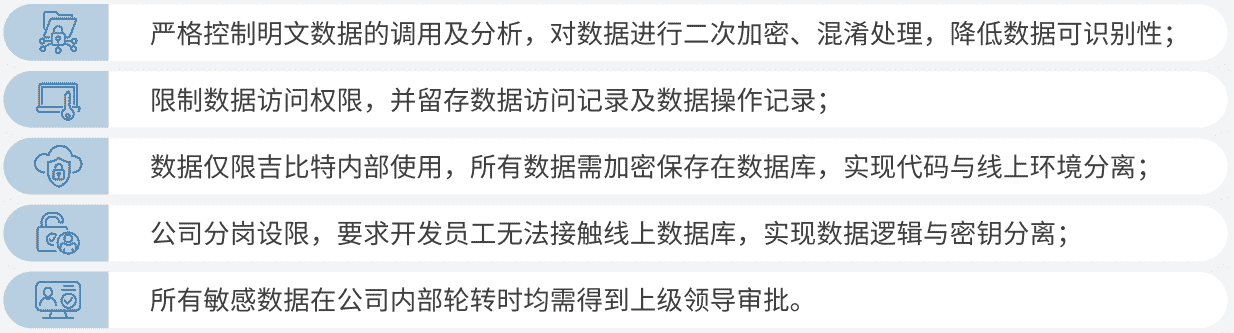 公司对用户个人信息实施脱敏处理,,严格限制用户信息用途,,数据使用完成后集中归档处理。。。。为进一步确保数据处理过程的安全,,公司根据实际的业务工作分岗设限,,,,最大程度保护数据隐私安全,,,,如在生产网络中的加密数据由研发部门员工负责编写加、、解密程序,,但其无法直接访问到加密后的数据库;程序的加、、、、解密密钥由运维员工单独配置。。。