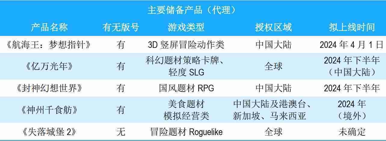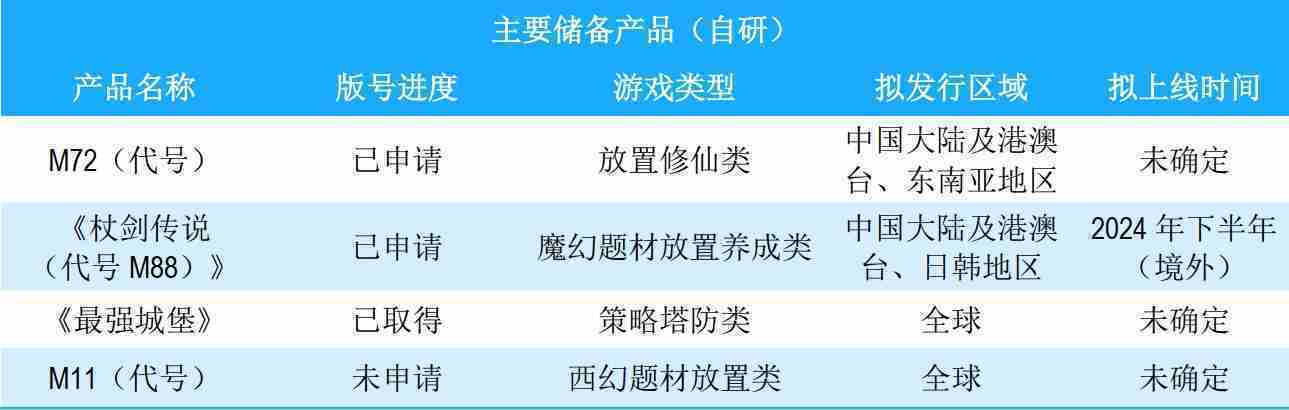 公司储备的多个自研、、、、代理产品都在有序推进当中,,涵盖放置类、、、策略类、、、模拟经营类、、、、RPG、、、Roguelike等多元化游戏品类,,,储备的主要自研和代理产品如下::::